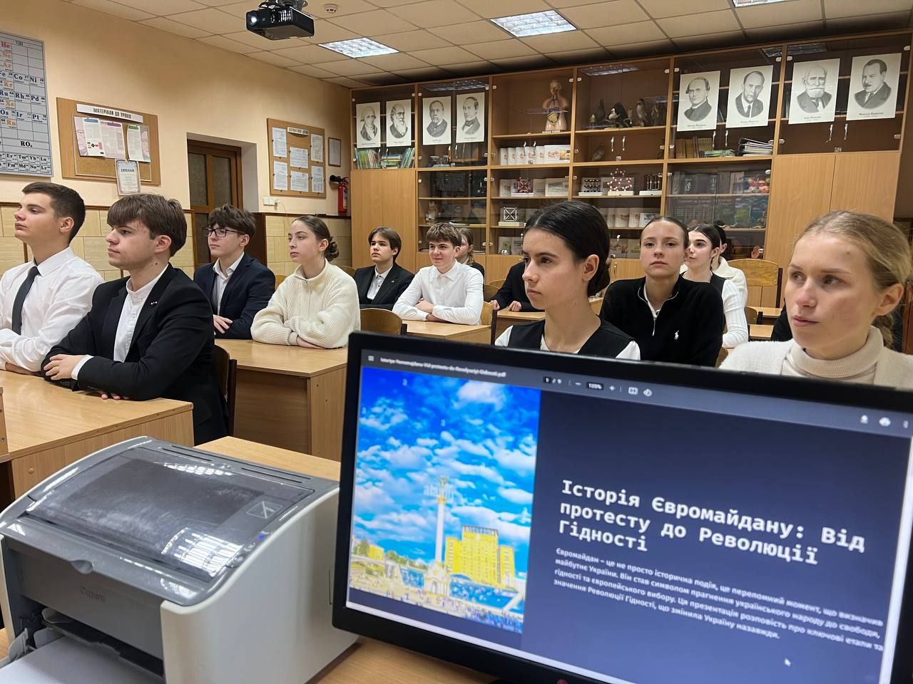 Мультимедійна презентація та відеоролики перенесли учнів у ті далекі часи та вималювали образи політичних діячів Західноукраїнської Народної Республіки, вояків Української Галицької Армії, учасників національно-визвольних змагань.
