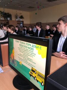 З метою закріпити і актуалізувати знання учнів з правил дорожнього руху, розвивати вміння і навички свідомо дотримуватися правил дорожнього руху, щоб уникнути травм і нещасних випадків в 10-В класі було проведено бесіду-презентацію « Правила поведінки на дорозі в темну пору доби»