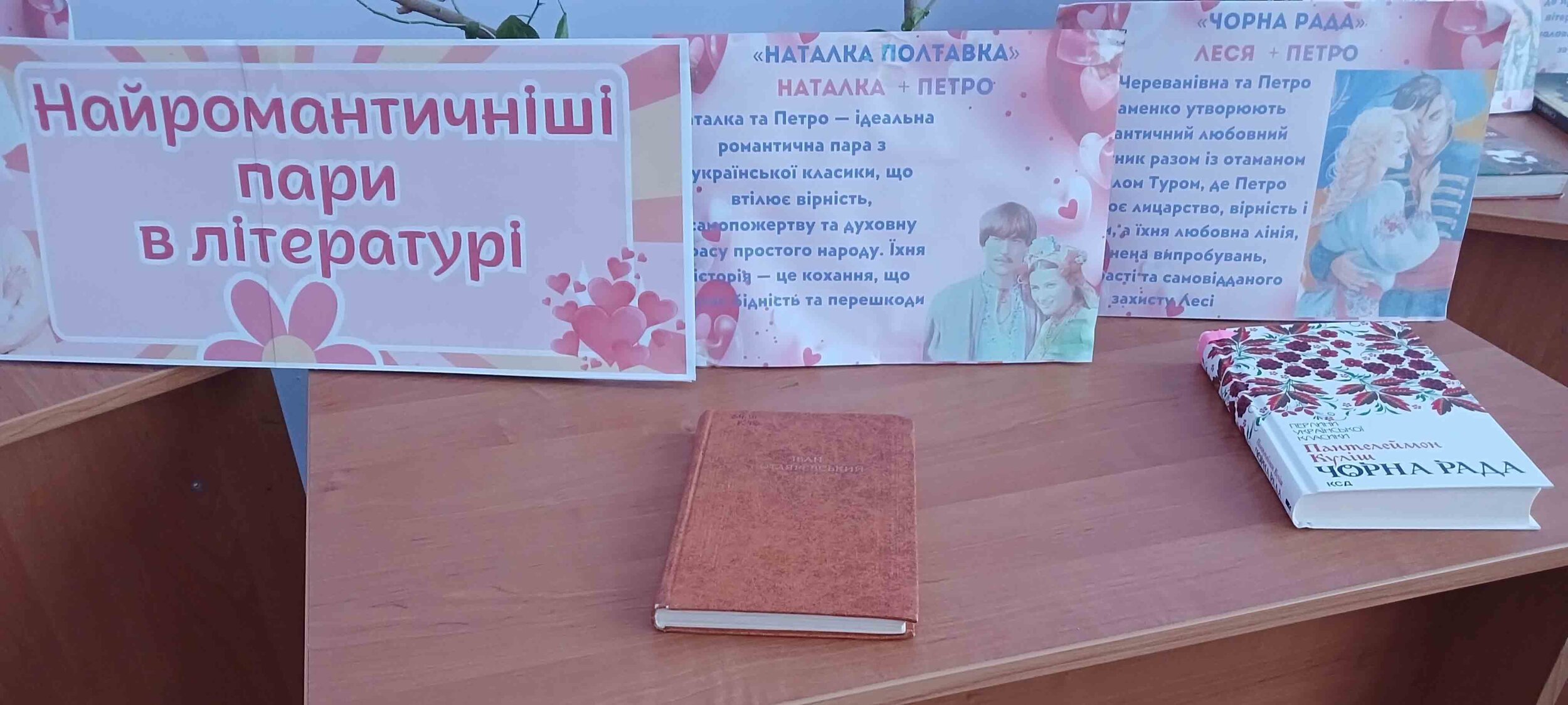 Вічна тема кохання притаманна багатьом творам українських письменників, що в своїх творах відображають щирі почуття, жертовне кохання і трагічні пристрасті. До Дня закоханих, у бібліотеці Центральноукраїнського наукового ліцею (м. Олександрія) організовано книжкову виставку «Найромантичніші пари в літературі». Тут переплелися долі багатьох людей.
