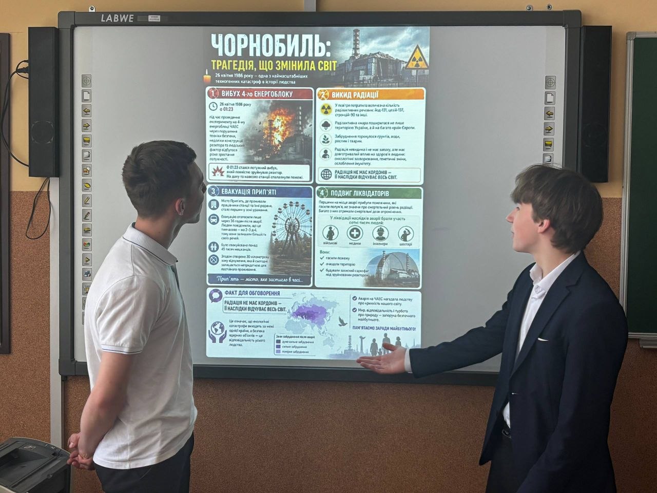 Для учнів 11-Б класу було проведено годину спілкування, присвячену 40 річниці трагедії на Чорнобильській АЕС. Ліцеїсти ознайомилися з подіями 26 квітня 1986 року, наслідками аварії та евакуацією мешканців Прип’яті.