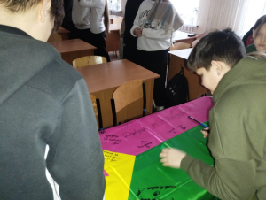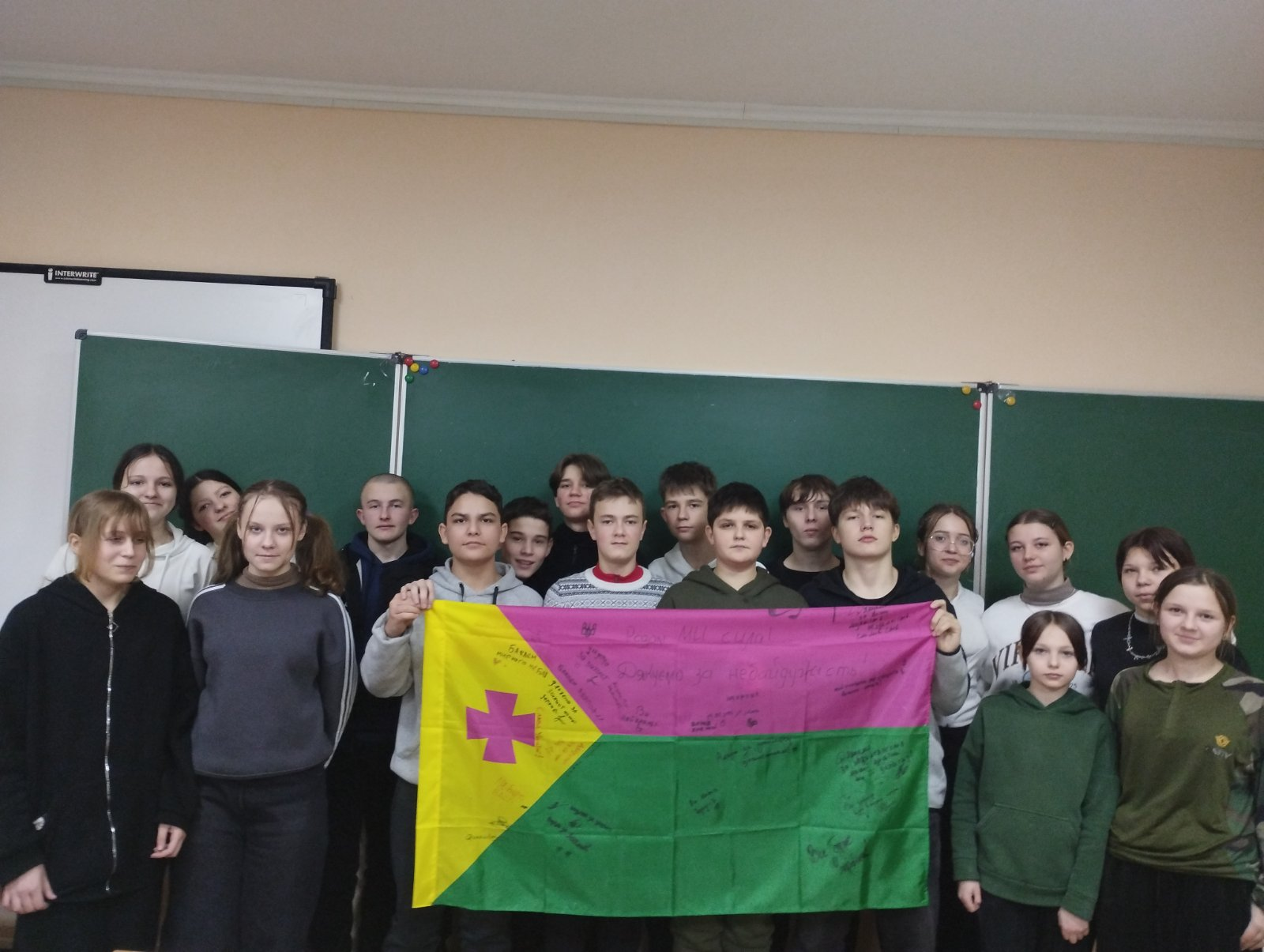 Найбільш емоційним моментом заходу став фінал. Учні разом із Оленою Віталіївною підготували особливий подарунок для наших воїнів. На прапорі міста Олександрії кожен восьмикласник залишив щирі слова вдячності та побажання для захисників, які зараз боронять соборність України на фронті.