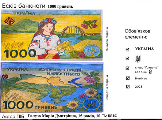 Галузо Марія розробила свій унікальний дизайн банкноти номіналом 1000 гривень під назвою "Купюра гривні майбутнього". Банкнота символізує Україну - від гір до степів, від лісів до морів, від традицій до інновацій, адже майбутнє держави неможливе без її коріння.