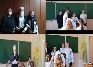 Сьогодні у 8-му класі відбувся цікавий урок української літератури, проведений удрявеньковою Оленою Віталіївною. Весь наш клас організував 3 інсценізації. Ми хотіли показати моменти з "Билини про Ілля Муромця та Солов'я" тому ми розділилися на 3 групи. 1 група показала зустріч богатиря з мурзами і коршем татарським. Мурза - титул знатного татарина. Корш- це військовий загін. Учні показали епічну битву Іллі Муромця та татар.