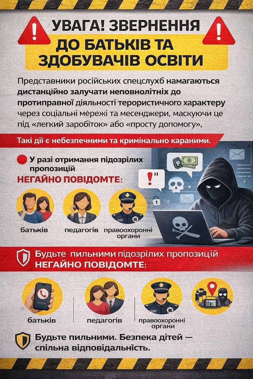 Під час бесіди обговорювалися основні способи вербування в онлайн-просторі, характерні ознаки небезпечної комунікації, можливі ризики та відповідальність за залучення до протиправної діяльності. Особливу увагу було приділено розвитку критичного мислення, навичкам безпечної поведінки в мережі та усвідомленню важливості власного свідомого вибору.