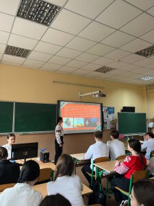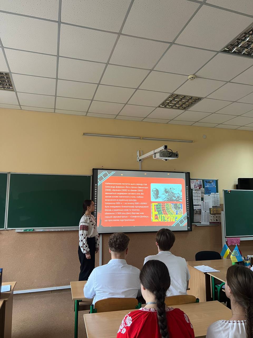 Бабаян Анна підготувала змістовну презентацію, у якій продемонструвала перші фільми початку ХХ століття , зокрема фільми Олександра Довженка — «Звенигора», «Арсенал», «Земля» та порівняла їх із сучасними фільмами «Кіборги», «20 днів у Маріуполі», «Довбуш» та «Конотопська відьма», що здобувають популярність у всьому світі. Учні мали змогу побачити, як виглядали перші кінотворчі експерименти, чим вирізнялася творчість Олександра Довженка та інших класиків, а також дізнатися про роботи сучасних режисерів, що формують нову хвилю українського кіно.Наприкінці заходу учні мали змогу переглянути фрагменти фільму «Червоний» створений за однойменним романом Андрія Кокотюхи та є одним із найяскравіших прикладів сучасного українського історичного кіно. Фільм про незламність українця, який навіть у нелюдських умовах радянського табору зберігає честь, гідність і готовність боротися за свободу.