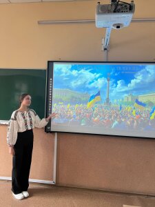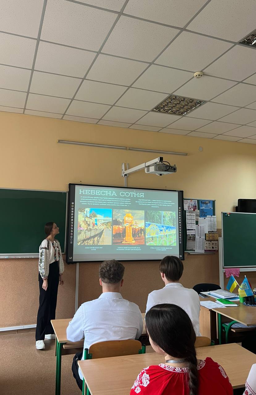 З метою виховання національно свідомої молоді в 11-В класі була проведена тематична година на тему «Майдан-символ боротьби за Гідність та Свободу». Учениці А. Дарій та А. Гонжа підготували змістовну презентацію про події 2004 та 2013 років.
