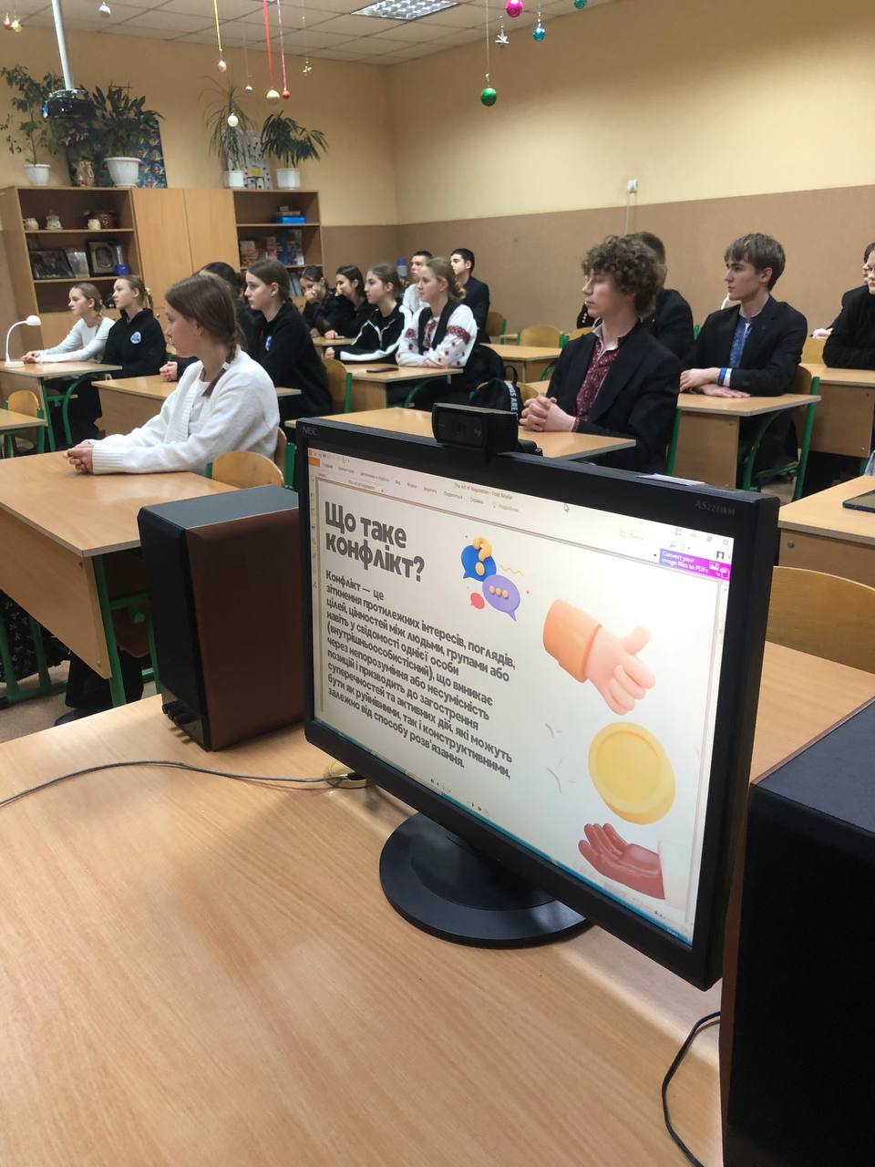 З метою  навчити учнів пошуку шляхів порозуміння з іншими людьми, розв’язувати конфліктні ситуації та намагатися уникати їх, поважати особисте «Я» кожної людини, викликати прагнення бути співчутливим, турботливим, виховувати чуйне, гуманне ставлення до інших в 10-В класі було проведено бесіду-тренінг «Конфлікт без бою: мистецтво домовлятися»