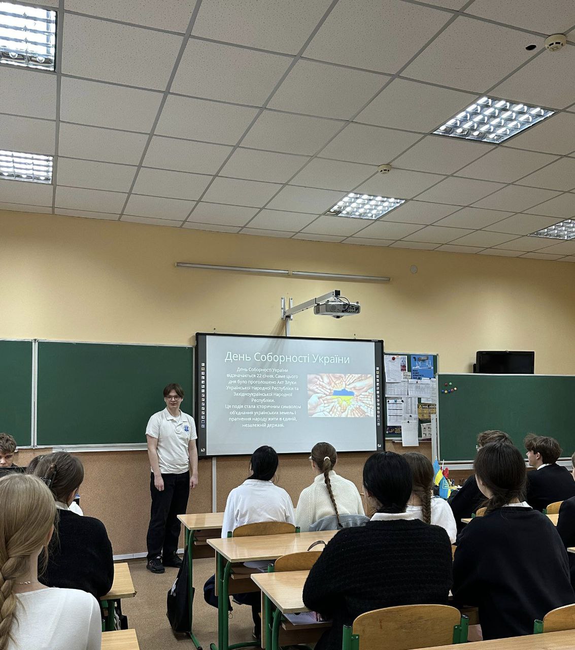 Це свято символізує не лише територіальну цілісність, а й духовну єдність українського народу. Учні згадали про події 22 січня 1919 року на Софійській площі у Києві. Саме тоді відбулося урочисте проголошення Акта Злуки Української Народної Республіки (УНР) та Західноукраїнської Народної Республіки (ЗУНР).