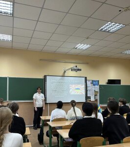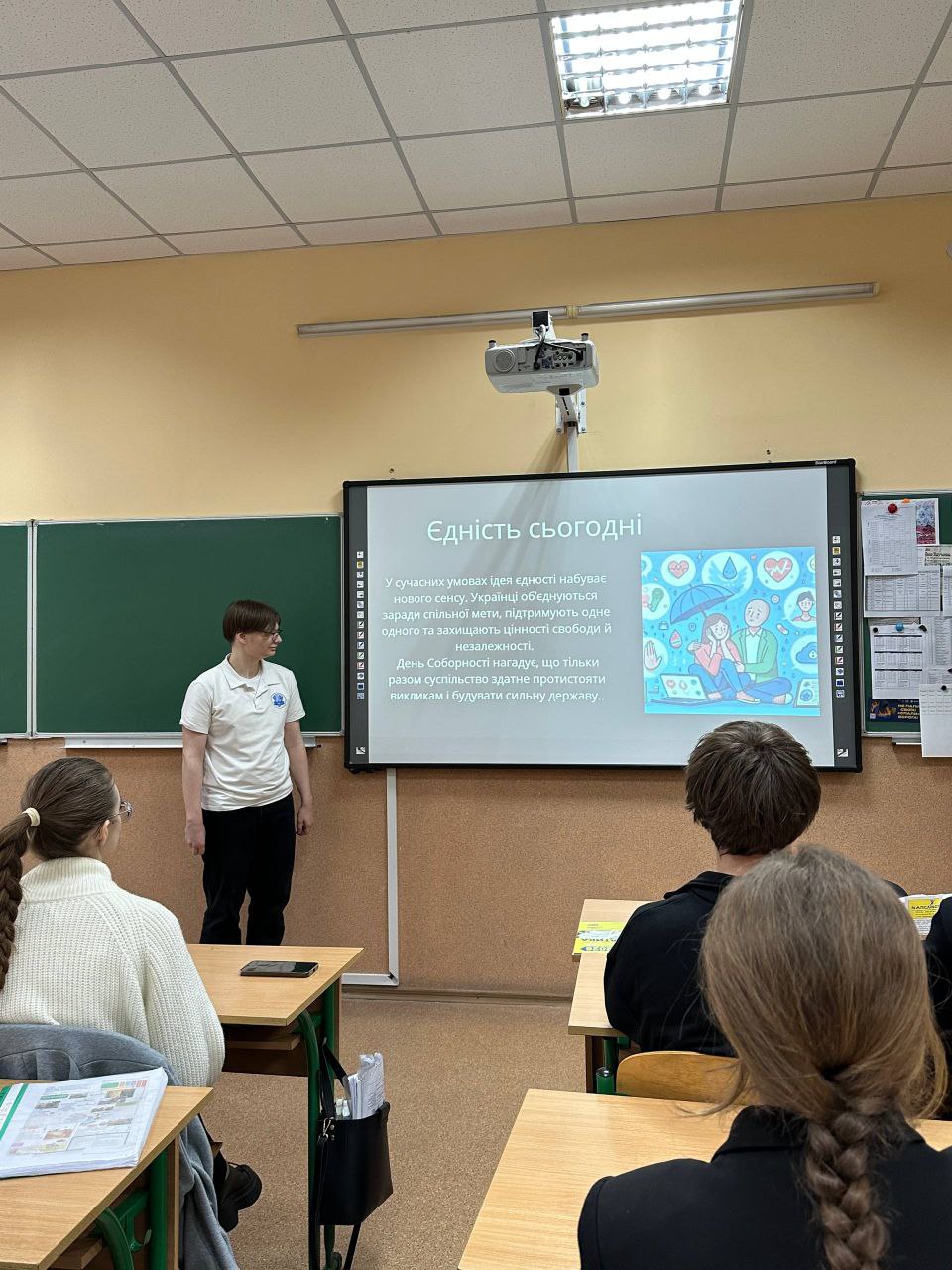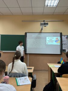 В 11-В класі була проведена тематична бесіда "В єдності сила: від проголошення до сьогодення!"Ліцеїсти Денис Максимець та Артем Кузьменко підготували змістовну презентацію та розповіли про історію свята.