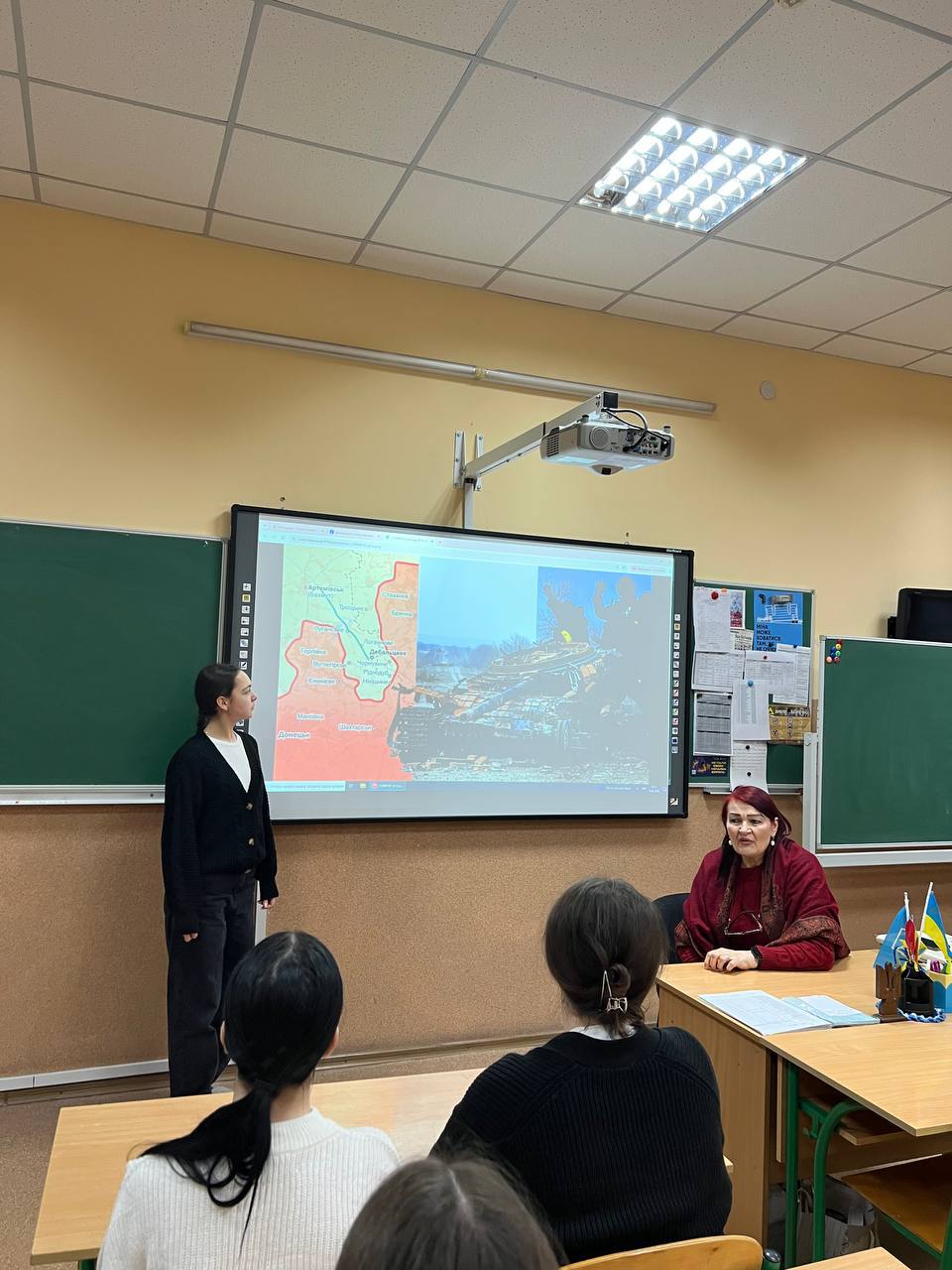 У заході взяла участь А.Бабаян, яка нагадала учням хронологію подій які відбулися під Дебальцевим, яке було важливим стратегічним вузлом Донбасу, тому за місто точилися запеклі бої. Українські військові після тривалої оборони під обстрілами організовано вийшли з Дебальцеве, зберігши людей і техніку. Ці події стали символом незламності української армії та нагадуванням про ціну свободи.