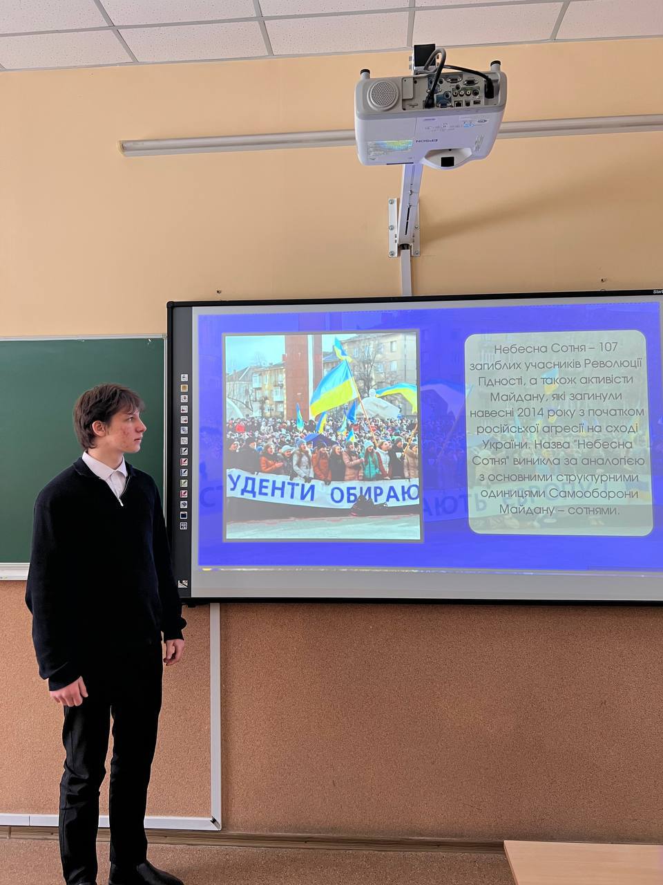Під час тематичної години учні М. Федченко та О. Довгополий згадали хронологію подій зими 2013–2014 років, розповіли про те, що назва «Небесна Сотня» виникла за аналогією з підрозділами самооборони Майдану — сотнями. Сьогодні ця назва об’єднує 107 загиблих учасників Революції та мирних протестувальників, які стали символом мужності, самопожертви й незламності українського народу.