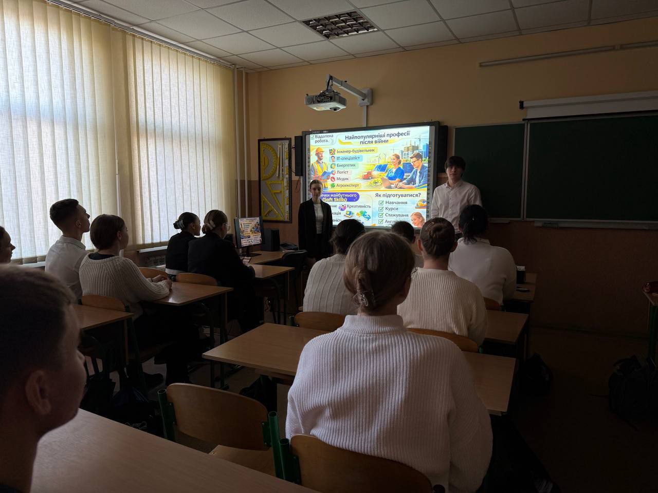 У 11-Б класі було проведено годину спілкування на тему «Нові професії на ринку праці України: які професії будуть затребувані після війни». Метою заходу стало ознайомлення учнів із сучасними тенденціями розвитку ринку праці та професіями майбутнього. Під час зустрічі старшокласники дізналися про основні зміни, які відбуваються у сфері працевлаштування. Особливу увагу було приділено професіям, що будуть затребувані під час відбудови України.