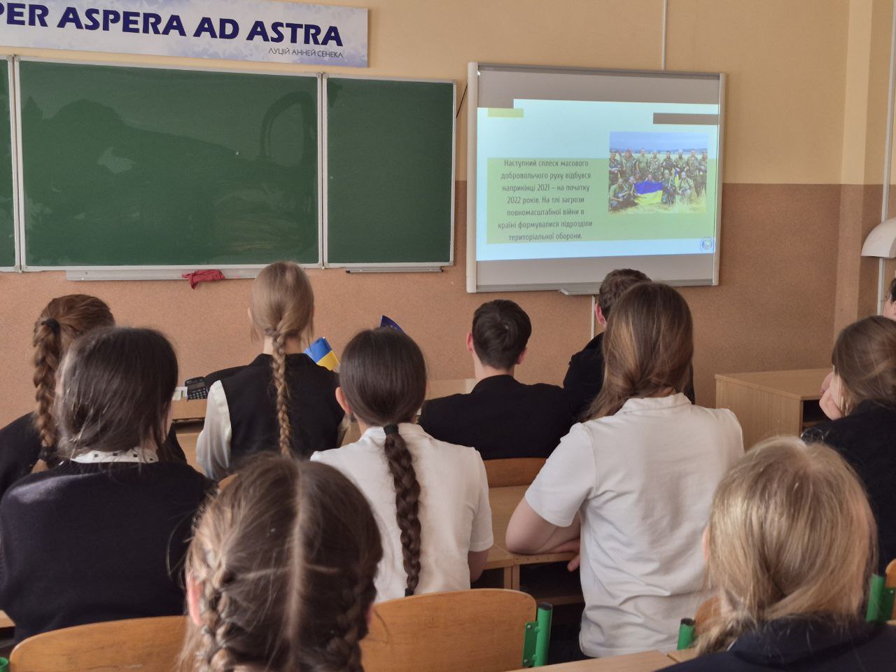 13 березня у 10-Б класі відбувся особливий урок мужності «Добровольці: сила нескорених». Це була не просто виховна година — це була щира розмова про відвагу, біль, відповідальність і любов до України.