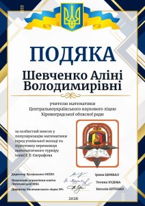 👏 Окрема подяка вчителю математики Шевченко Аліні Володимирівні за професіоналізм, підтримку та вагомий внесок у підготовку переможця!
